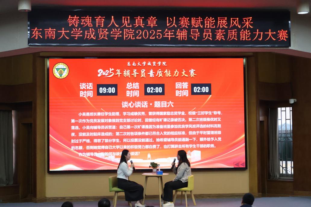 为深入学习贯彻习近平新时代中国特色社会主义思想和党的二十大和二十届历次全会精神,扎实推进“时代新人铸魂工程”,近日,东南大学成贤学院2025年辅导员素质能力大赛圆满落幕。大赛以“铸魂育人见真章 以赛育人展风采”为主题,旨在锤炼辅导员职业能力,涵养专业素养,有力推动了辅导员队伍专业化、职业化建设。